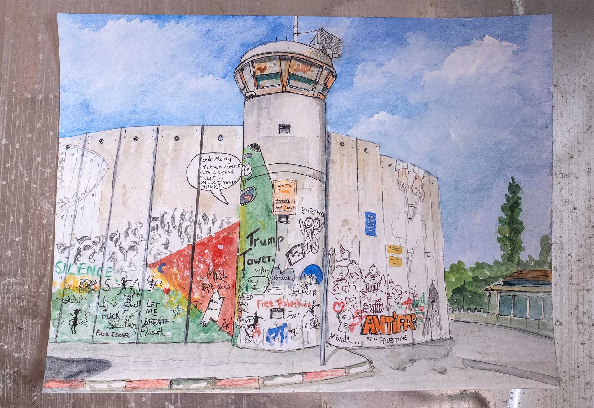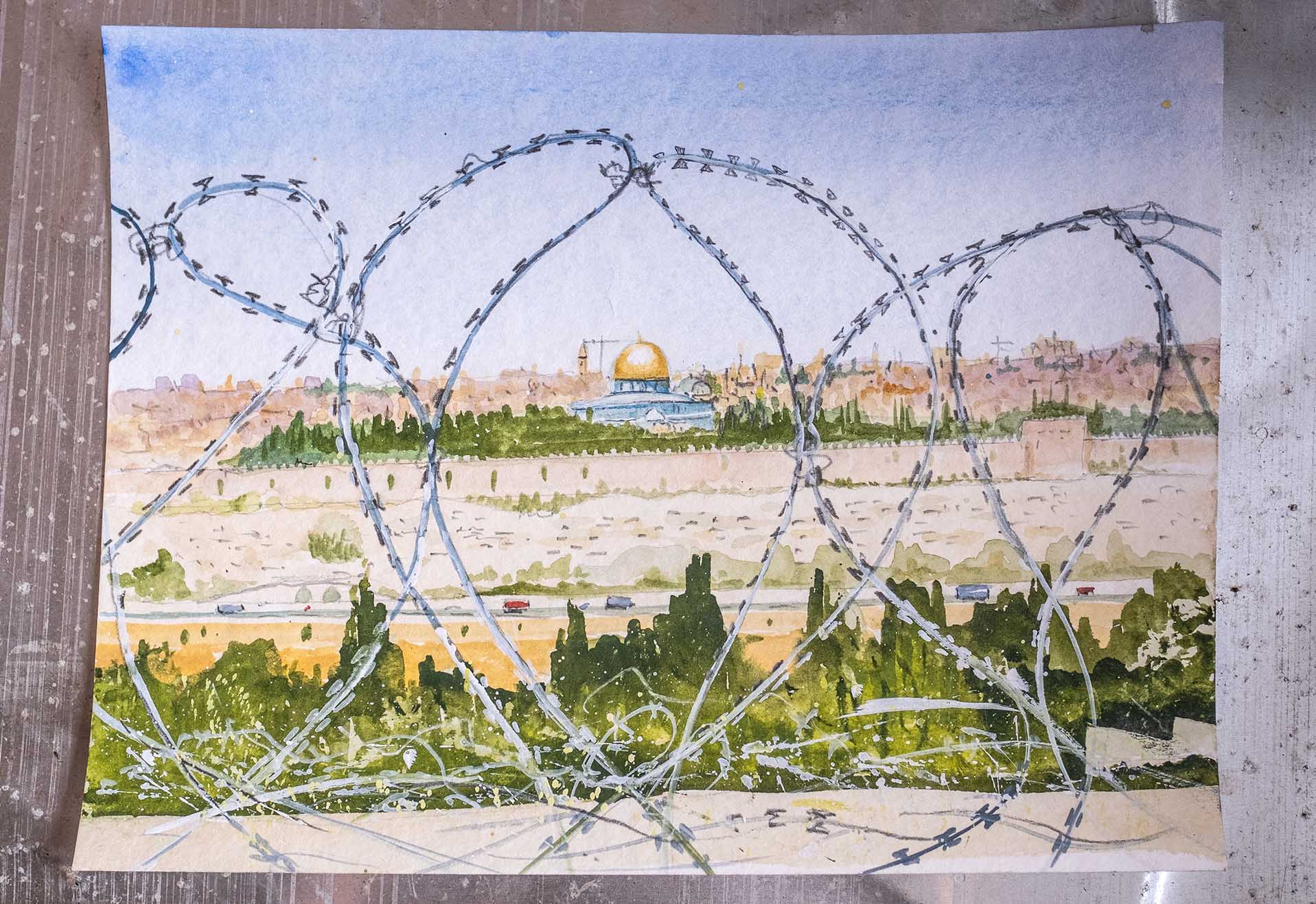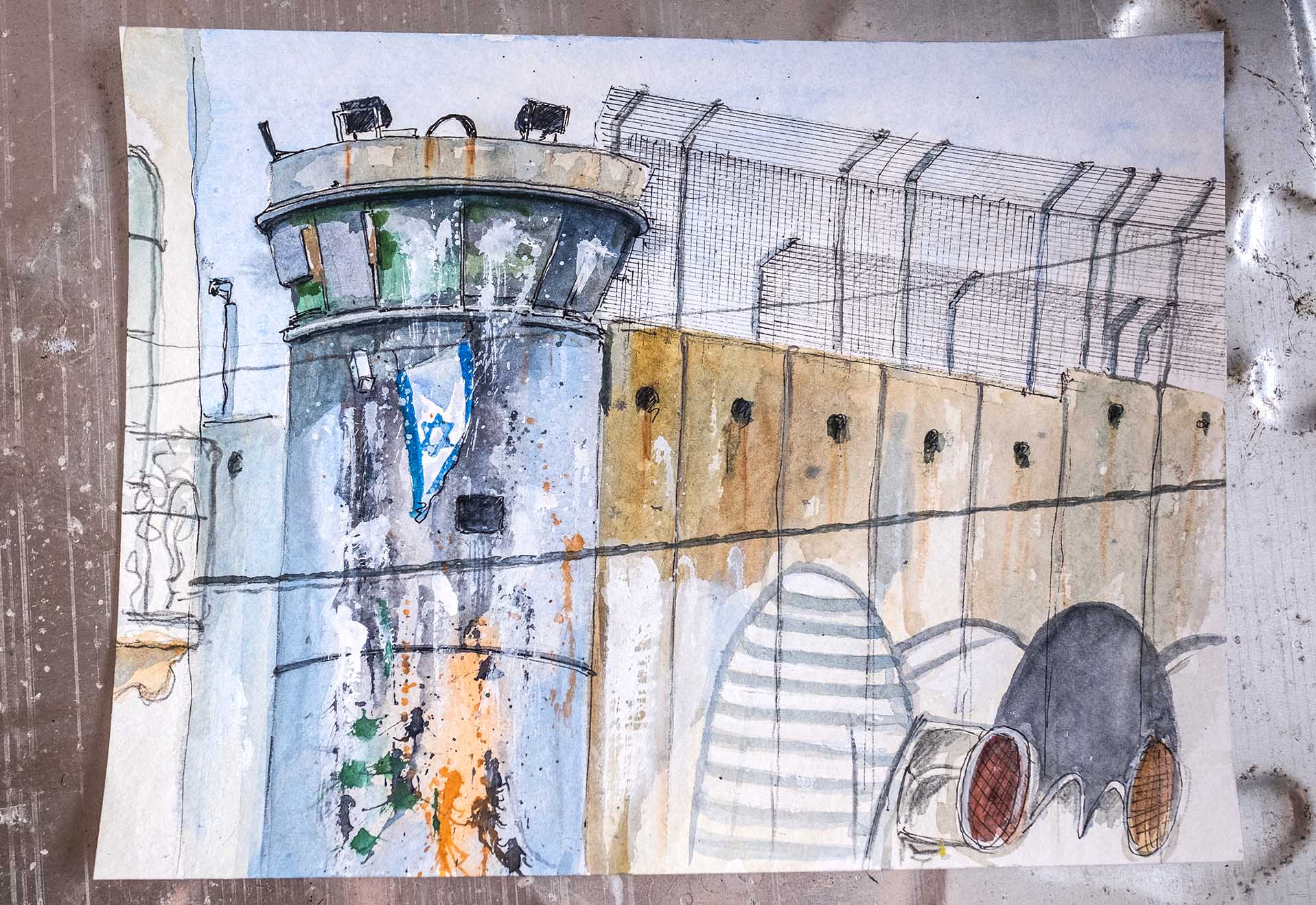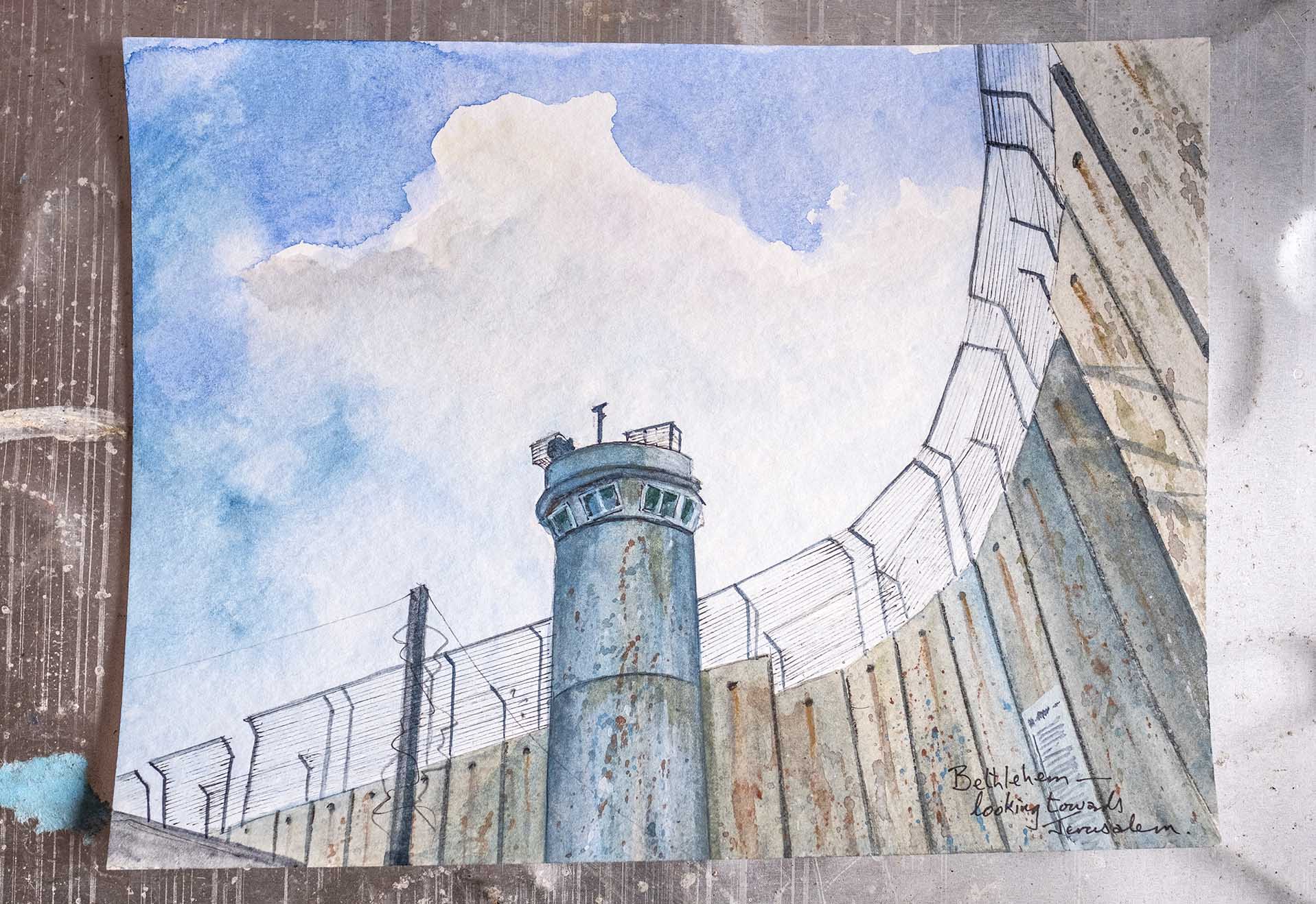 This project is my “beautiful resistance” to the desecration of this holy land. It records in film and painting my experience of living beside the Wall – ‘Drawing Attention’ to the harm it is doing to the Jewish, Moslem and Christian people in its shadow.