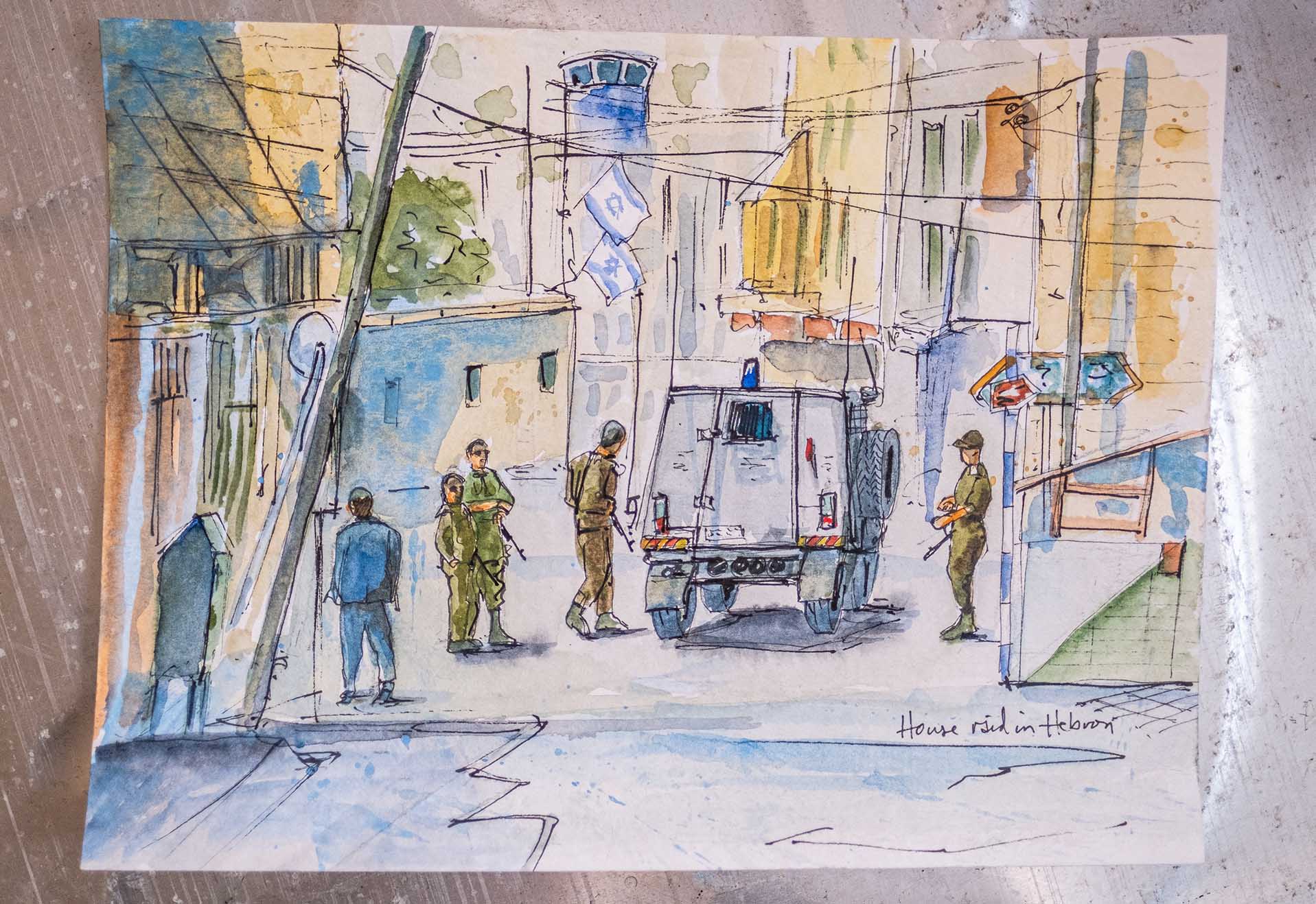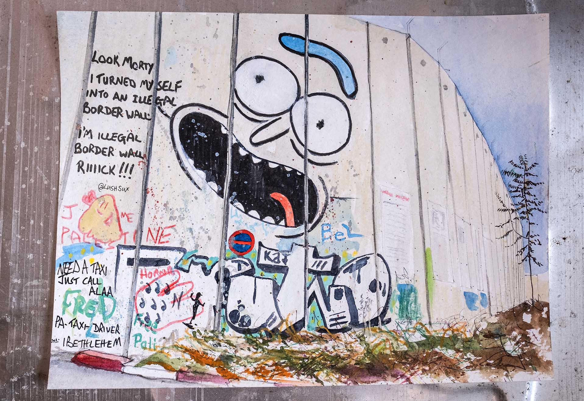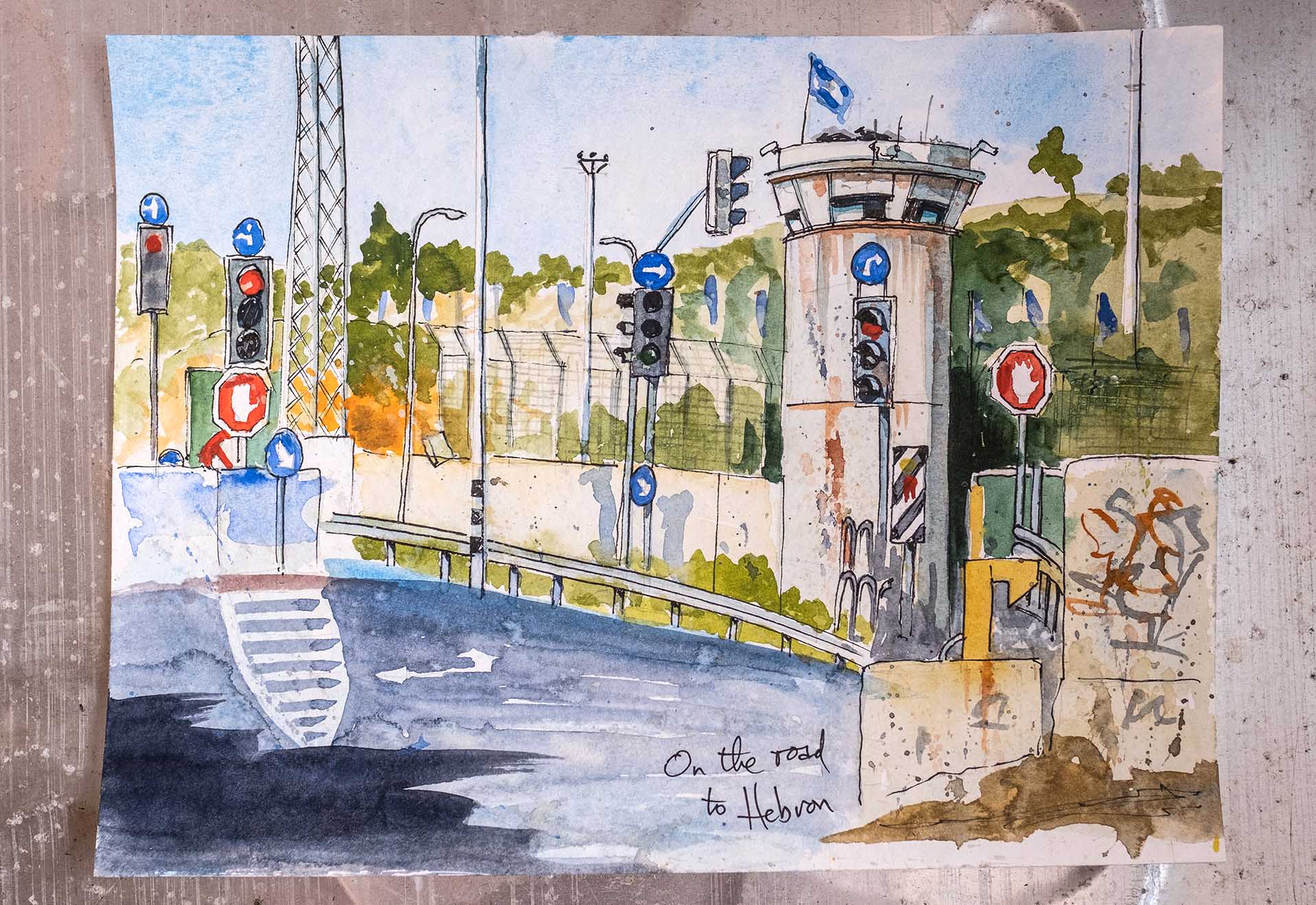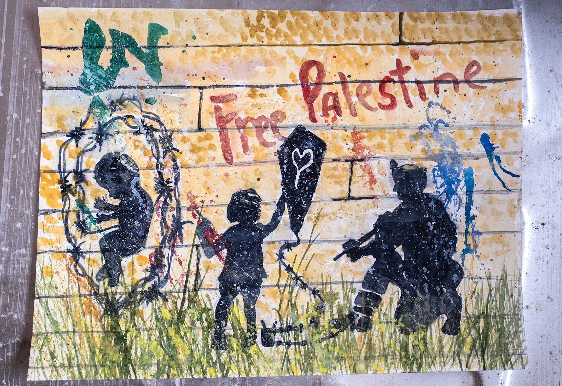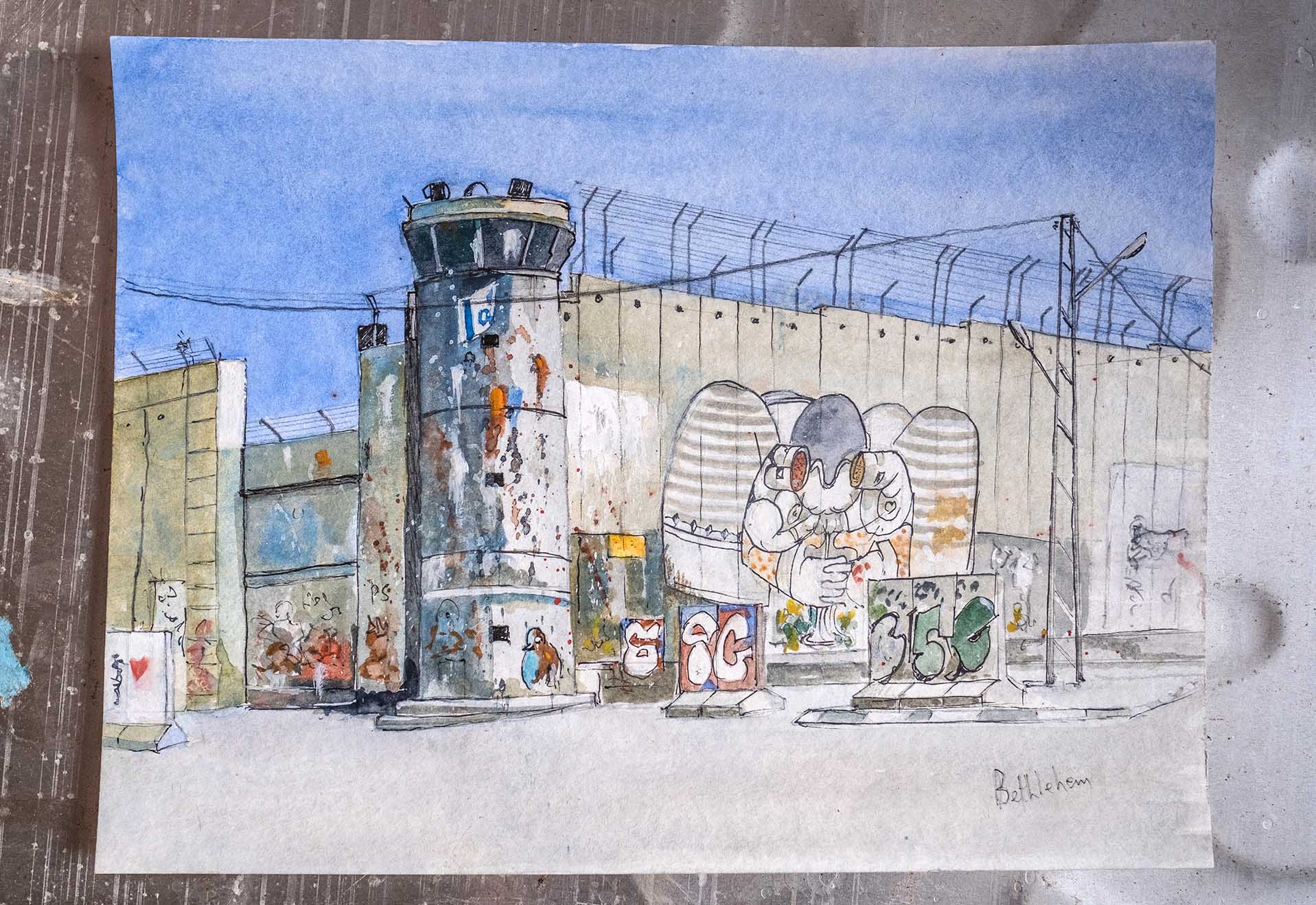 This project is my “beautiful resistance” to the desecration of this holy land. It records in film and painting my experience of living beside the Wall – ‘Drawing Attention’ to the harm it is doing to the Jewish, Moslem and Christian people in its shadow.